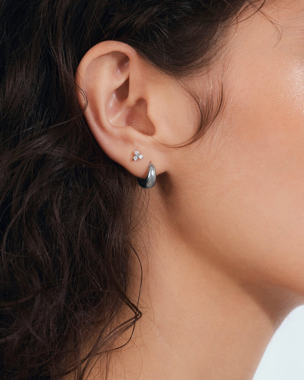 Crafted from implant-grade titanium and finished in a crisp silver tone, they’re easy to wear solo or style into a stack with studs and huggies.